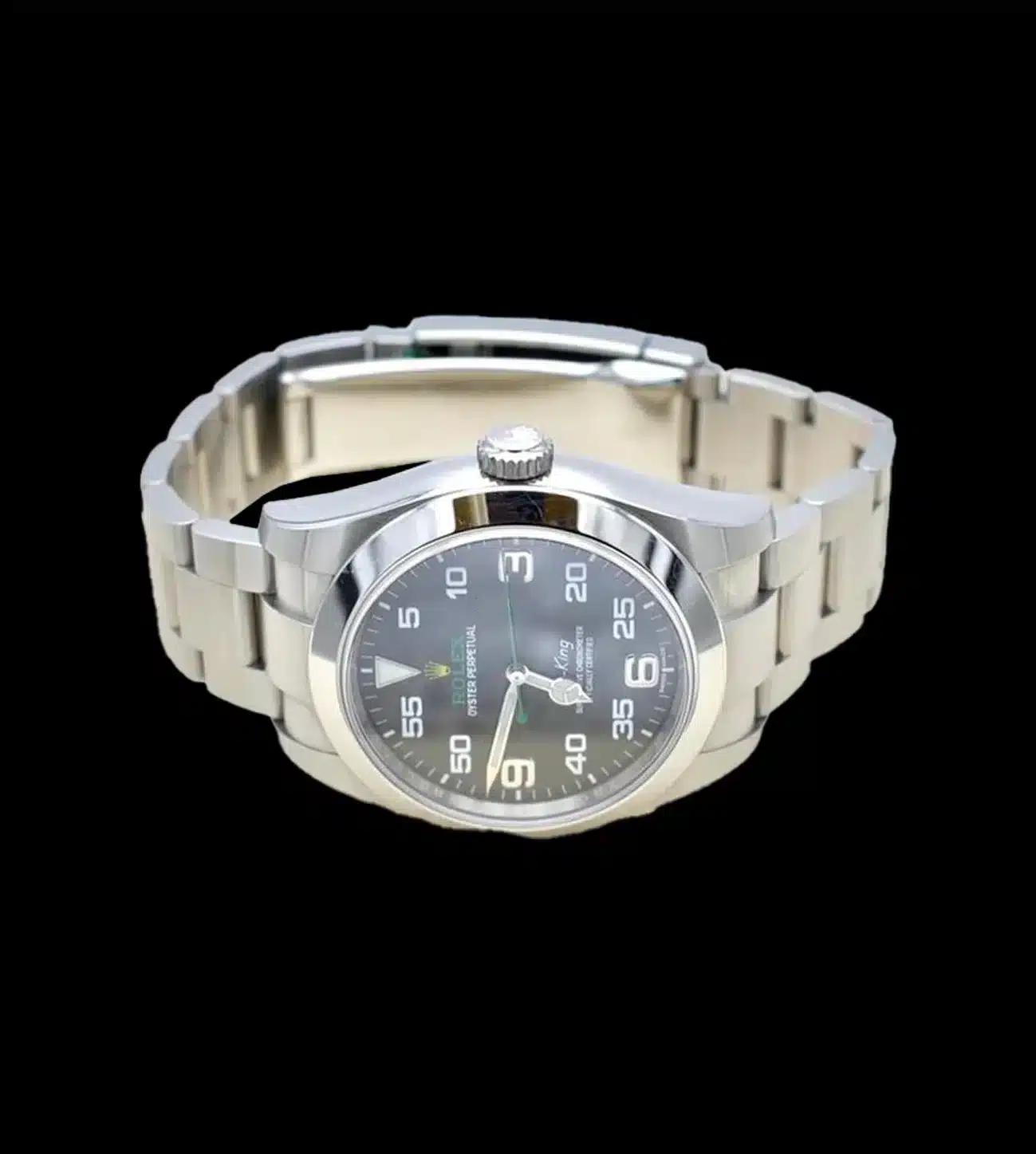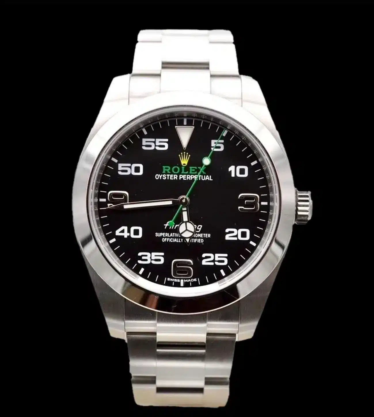 Fabricado con acero 904L de grado superior, este superclon Air King es resistente a los golpes y la corrosión, lo que lo convierte en una elección ideal para el uso diario. Su cristal de zafiro ultrarresistente asegura una protección óptima contra arañazos y mantiene una claridad impecable.