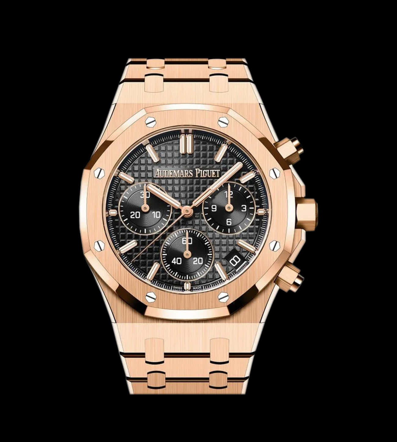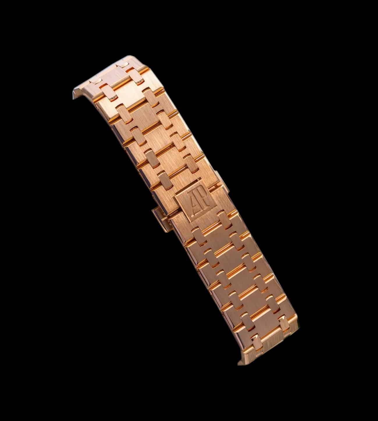 Brazalete Integrado: Pulsera realizada completamente en oro rosa, con enlaces perfectamente integrados y acabados artesanales. El cierre desplegable con logo AP asegura comodidad y seguridad absolutas.