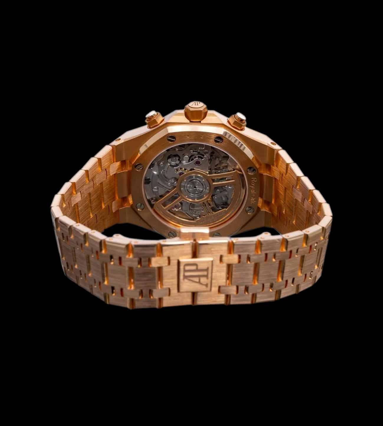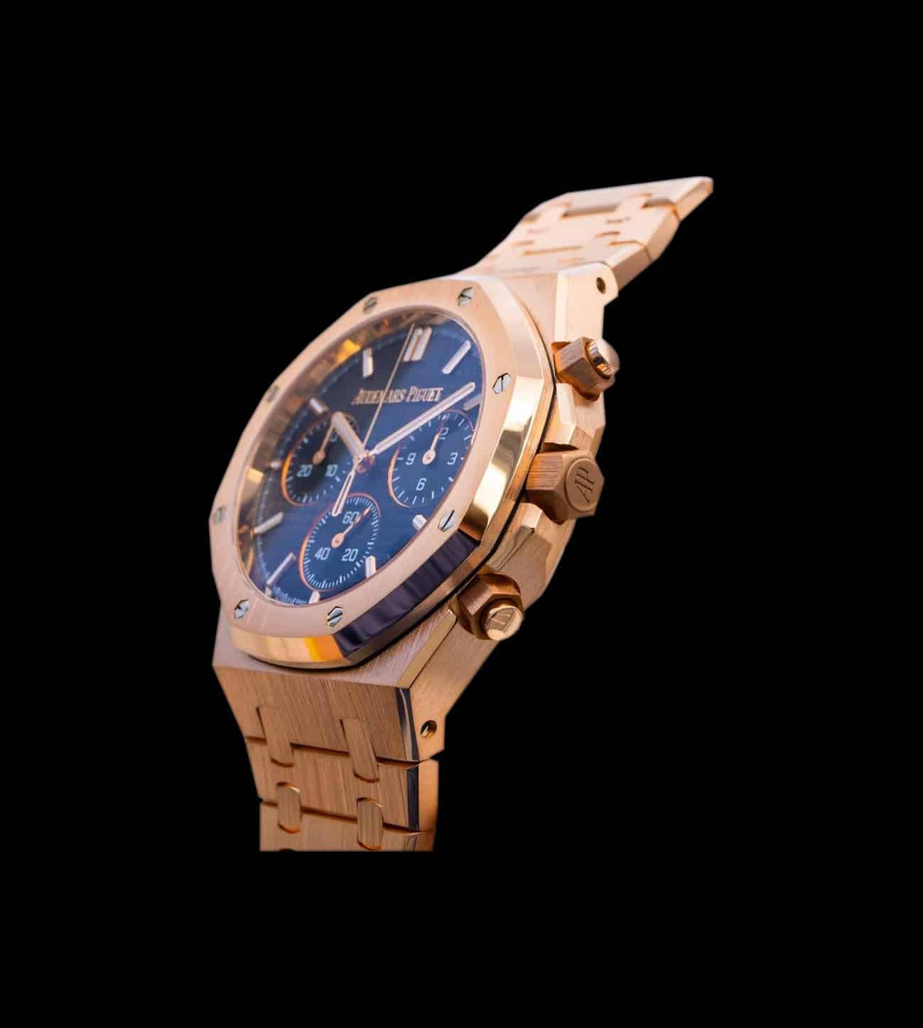 El Audemars Piguet Royal Oak Chronograph 26240 en oro rosa con esfera Black/Blue es la máxima expresión del lujo deportivo y la sofisticación contemporánea. Reconocido instantáneamente por su inconfundible bisel octogonal con tornillos visibles, esta pieza exclusiva se presenta en oro rosa de 18 quilates, destacando un refinamiento absoluto y una personalidad poderosa.