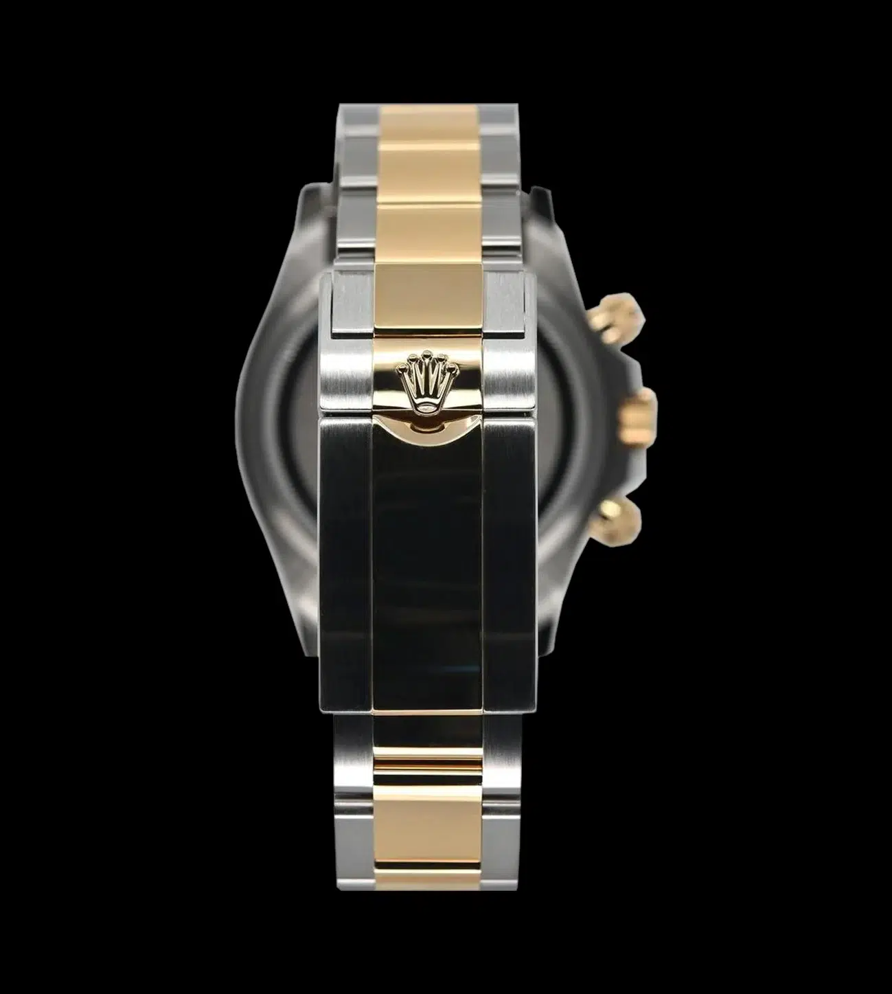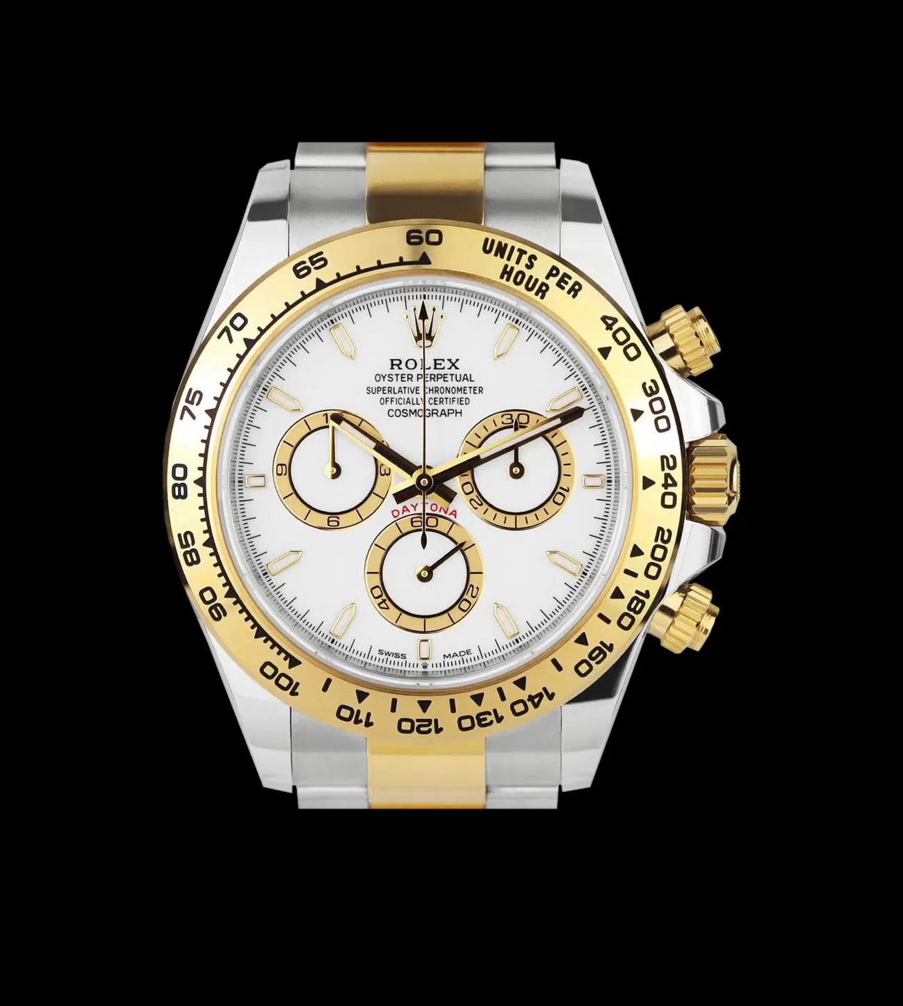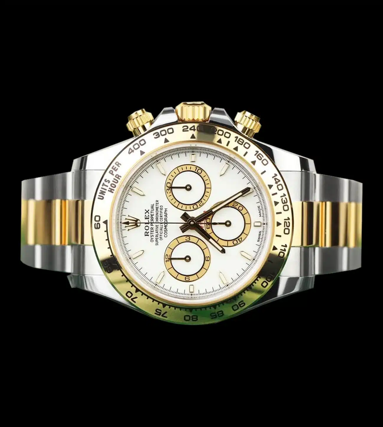 Este Daytona Bicolor superclon de IRW reproduce con fidelidad milimétrica una de las combinaciones más emblemáticas del original de la marca. Caja y brazalete Oyster en acero 904L laminado en oro de 18 quilates, esfera blanca con patrón lineal e interior técnico funcional.