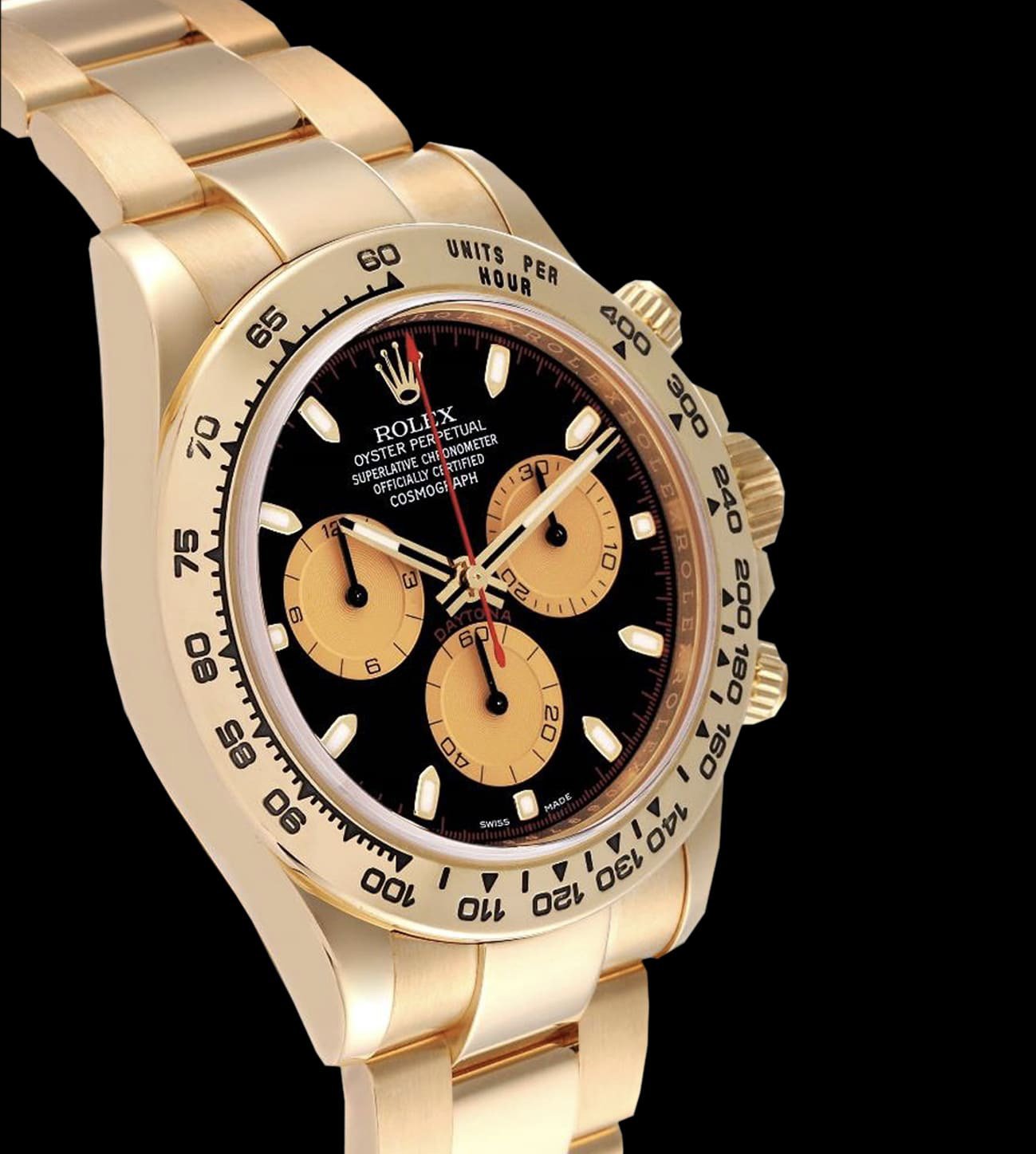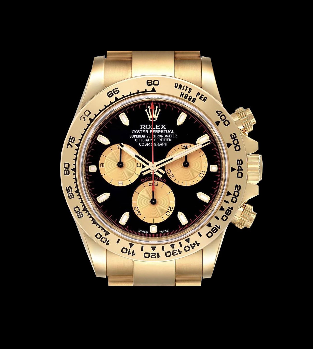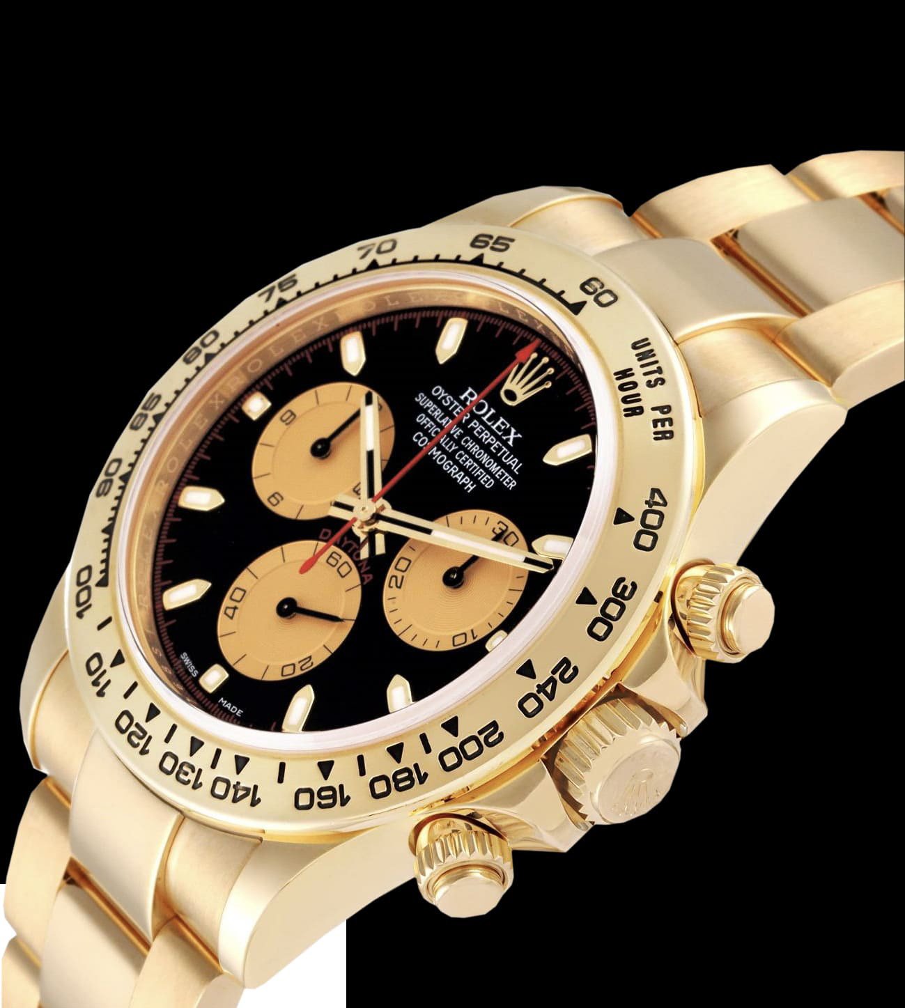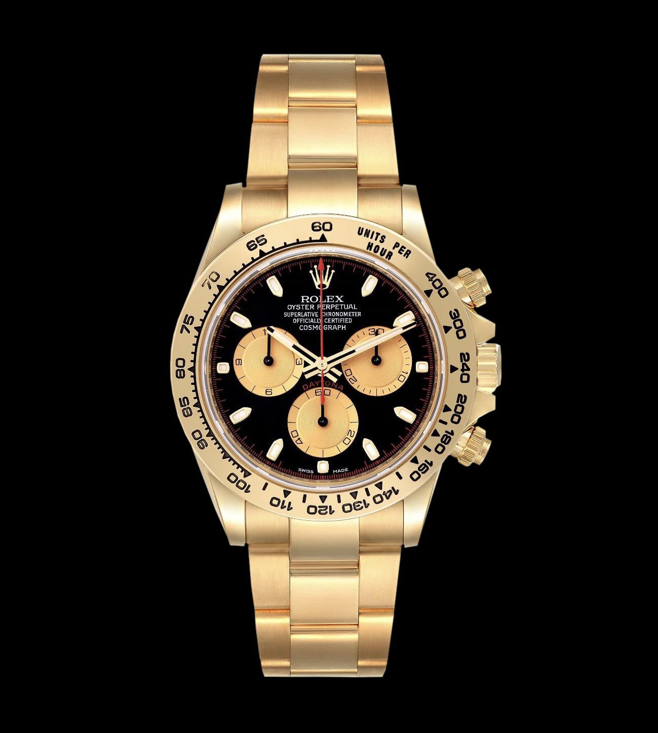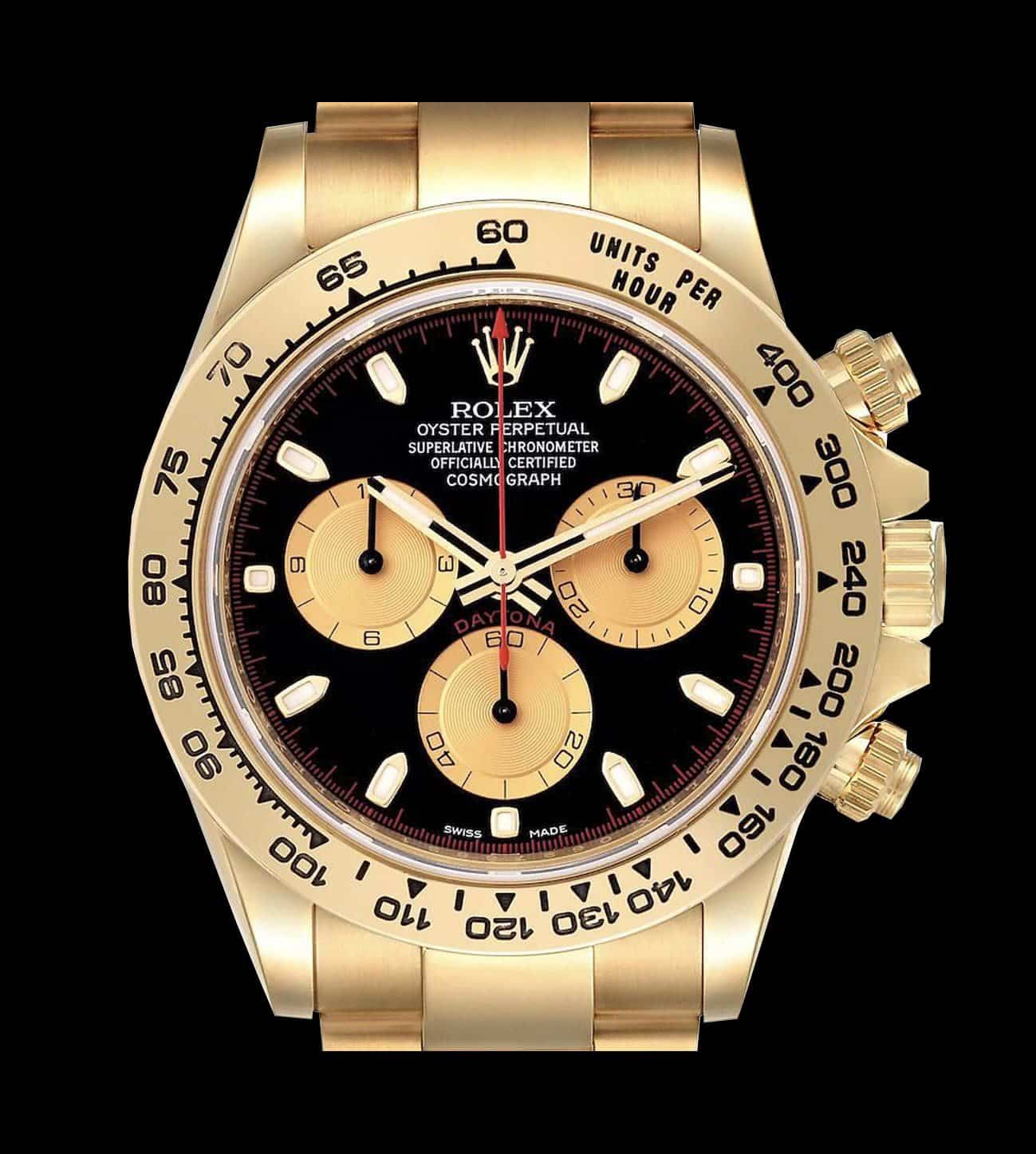 La esfera negra Newman replica incorpora subesferas caracoladas con acabado dorado satinado, índices aplicados y agujas tratadas con Chromalight. Esta configuración clásica ofrece contraste óptico y legibilidad tanto en interiores como en condiciones de baja luz. El diseño reproduce las proporciones y la simetría del Daytona histórico que Paul Newman convirtió en un ícono, equilibrando estética de época con prestaciones actuales.