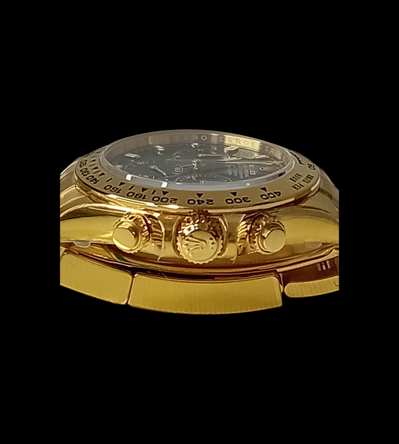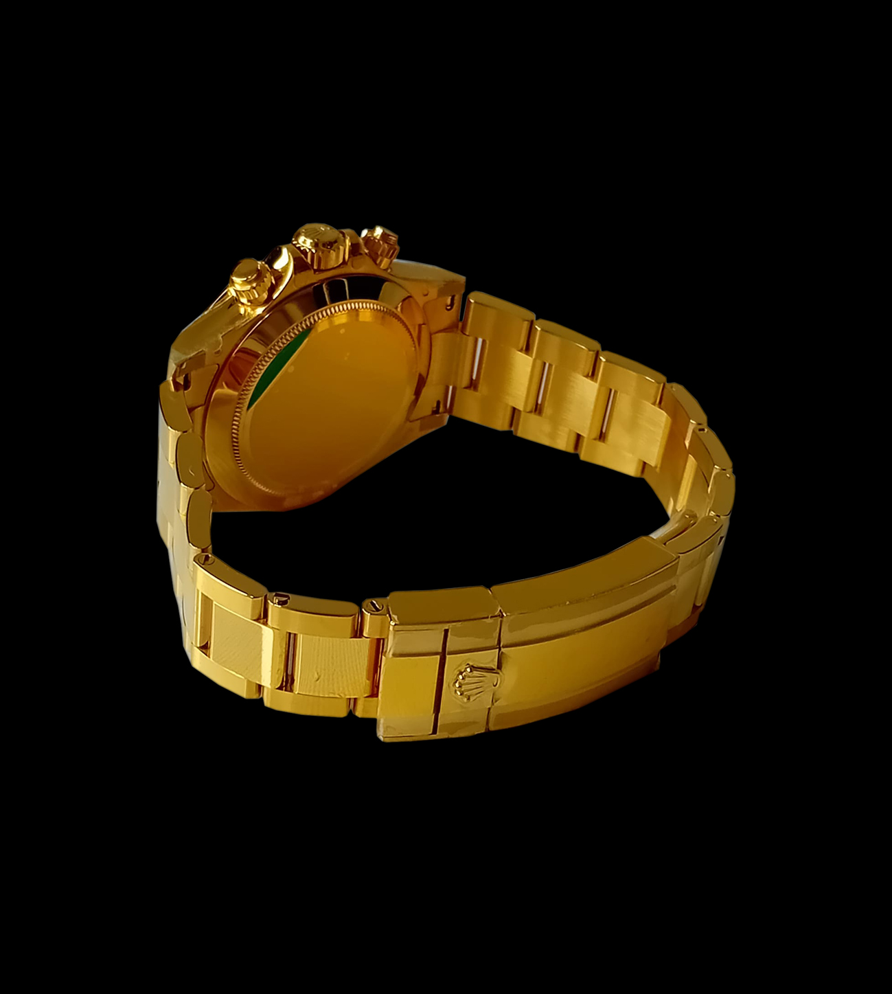 - Caja en acero 904L con laminado de oro 18K de alta resistencia: La caja está fabricada en acero 904L con rutenio y laminada con oro de 18 quilates por electrólisis, con 20 micras de espesor. Garantiza adherencia homogénea y durabilidad estructural. El recubrimiento DLC protege contra rayaduras, humedad y oxidación. La sensación en mano es idéntica a la del modelo original.
