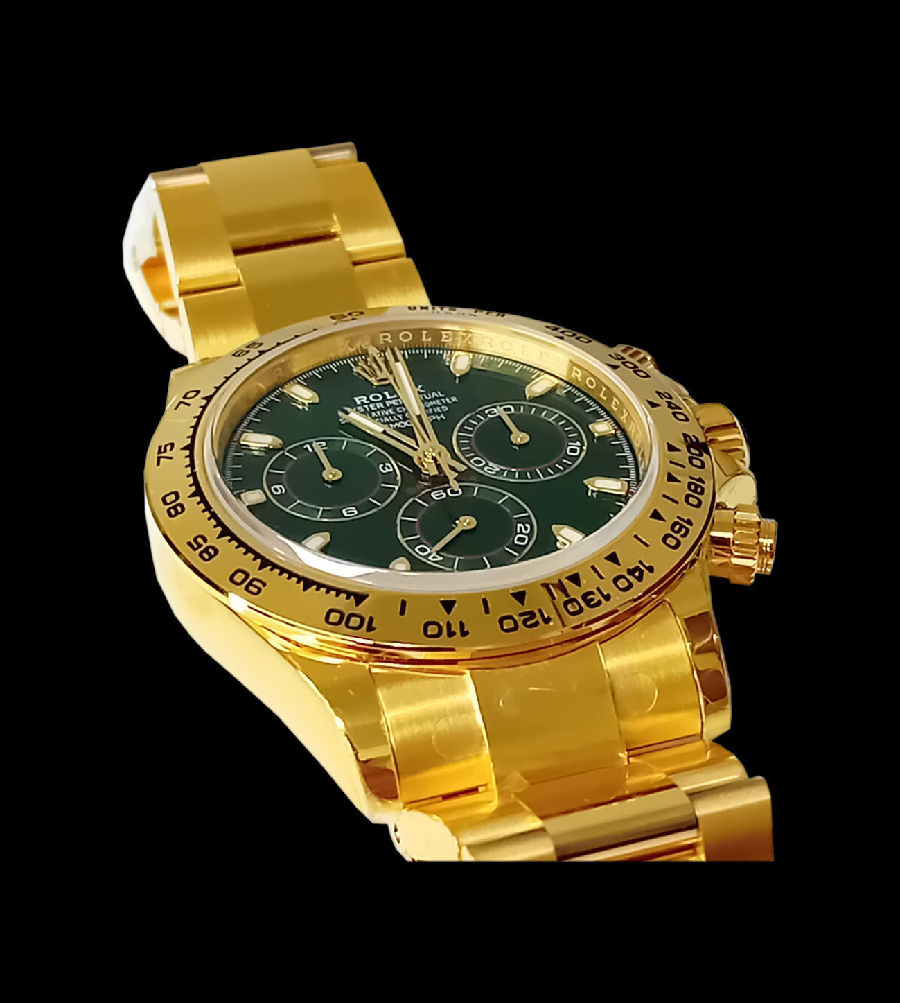 Esta réplica Rolex Daytona John Mayer IRW ensamblada en Florencia reproduce fielmente una de las ediciones más codiciadas del catálogo moderno original. Su esfera verde multicapa con acabado fotocromático capta perfectamente el tono John Mayer.